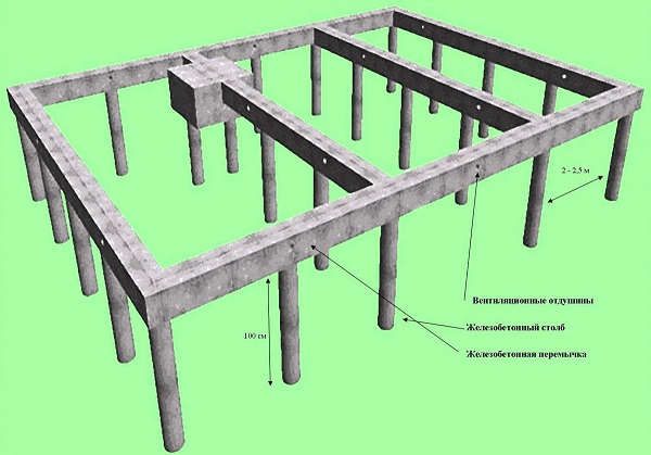 Столбчатый фундамент представляет собой несколько столбов, объединенных с помощью ростверка (горизонтальная обвязка). Ростверк необходим для совместной работы отдельно стоящих конструкций. Чтобы обеспечить устойчивость и предотвратить опрокидывание, столбы заглубляют в землю. Глубина заложения зависит от нагрузки от здания и характеристик грунта.